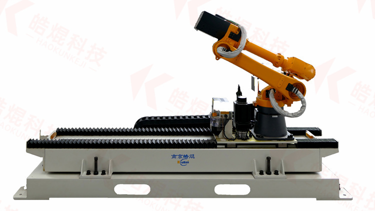 機器人行走軸采用矩形導軌和硬質滾輪作為運動導軌來代替直線導軌,優點是能夠提供可靠、耐用、低摩擦的線性導軌,特別適用于移動自動化設備的重物。軸承座采用帶密封、免維護圓錐滾子和深溝球軸承的滾輪。矩形導軌是采用整體淬火和精密研磨而成,與齒輪齒條及減速機組合,以提供一個強大的,可靠的第七軸。